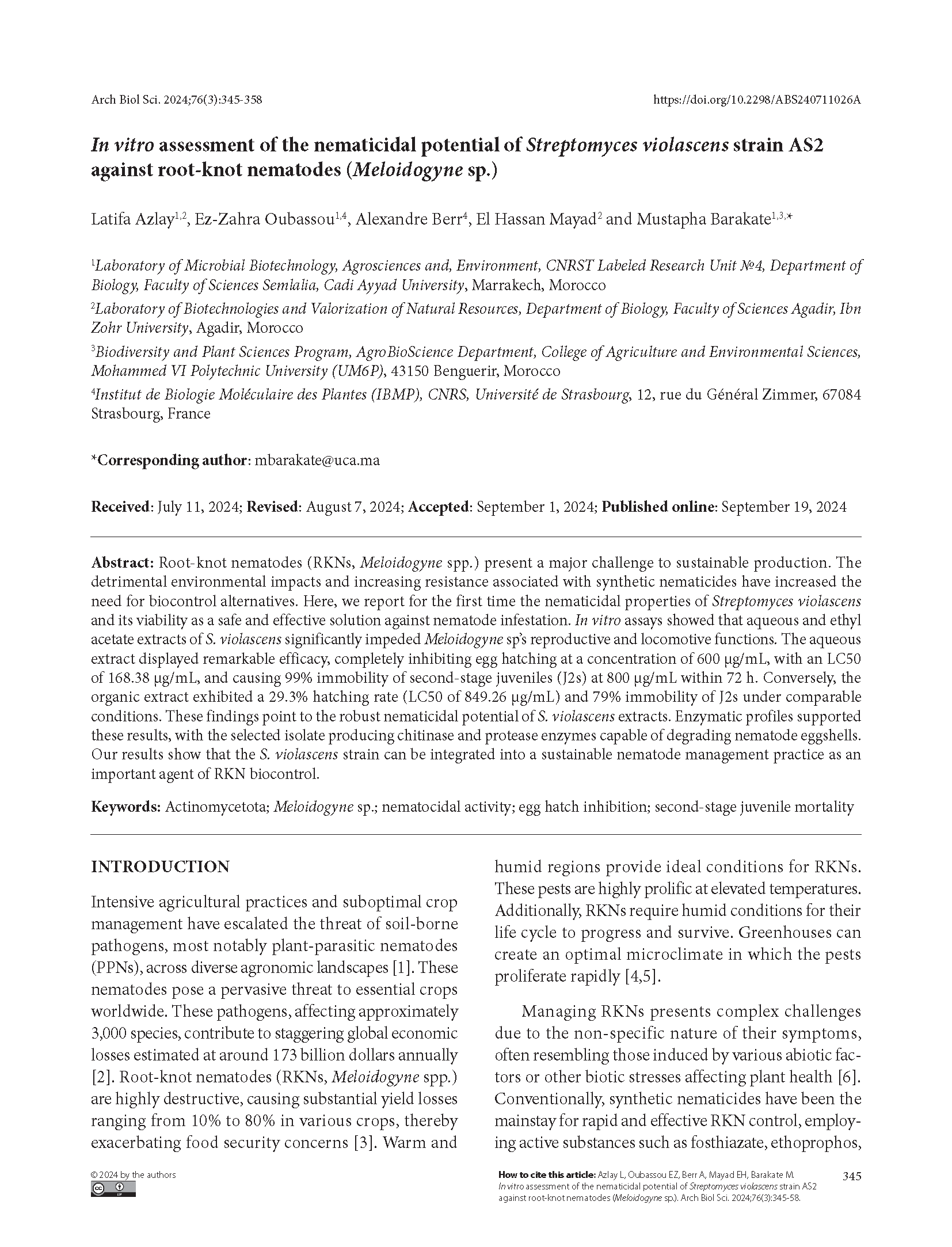 In vitro assessment of the nematicidal potential of Streptomyces violascens strain AS2 against root-knot nematodes (Meloidogyne sp.)